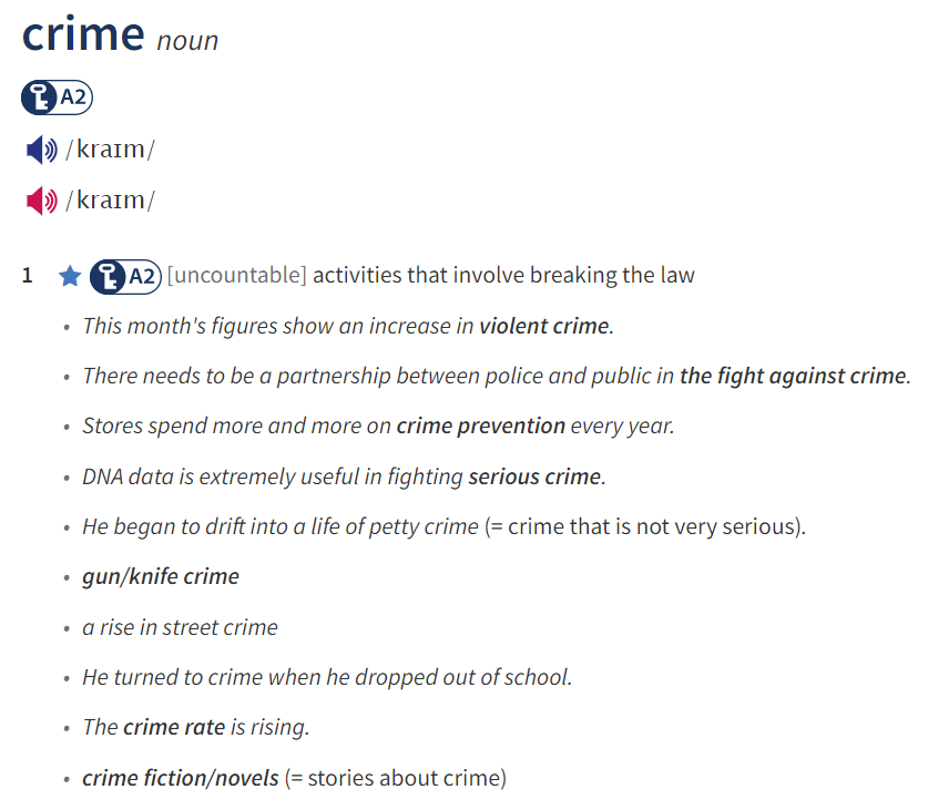 Look at the entry of the word ‘crime’ in a dictionary. Use what you can get from the entry to complete the sentences with two or three words.
