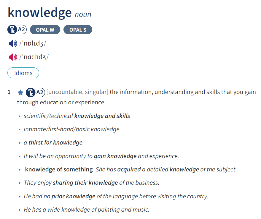 Look at the entry of the word ‘knowledge’ in a dictionary. Use what you can get from the entry to complete the sentences with two or three words.