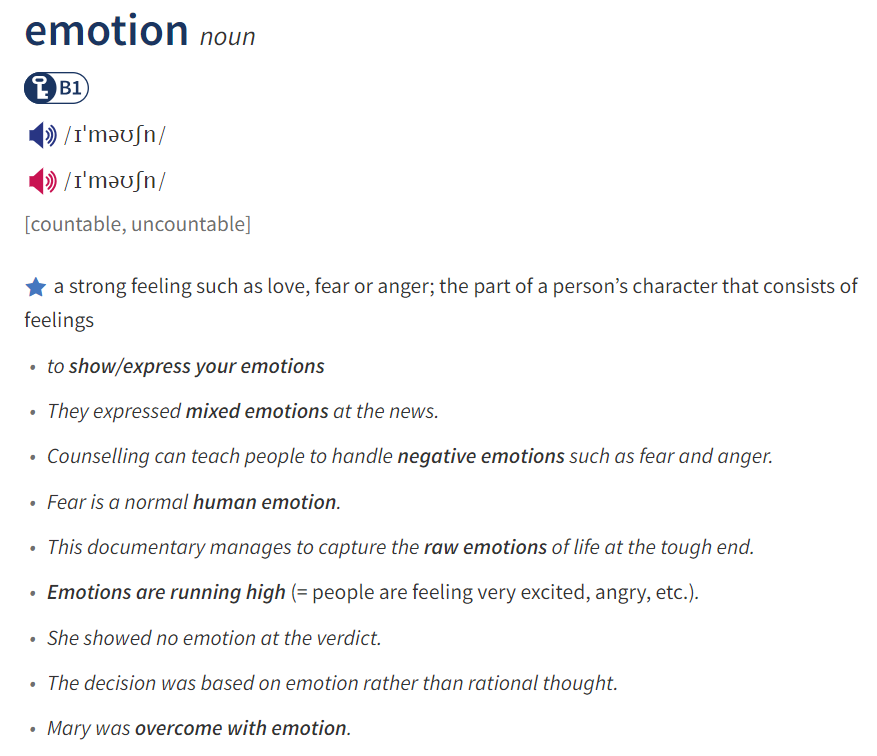 Look at the entry of the word ‘emotion’ in a dictionary. Use what you can get from the entry to complete the sentences with two or three words.