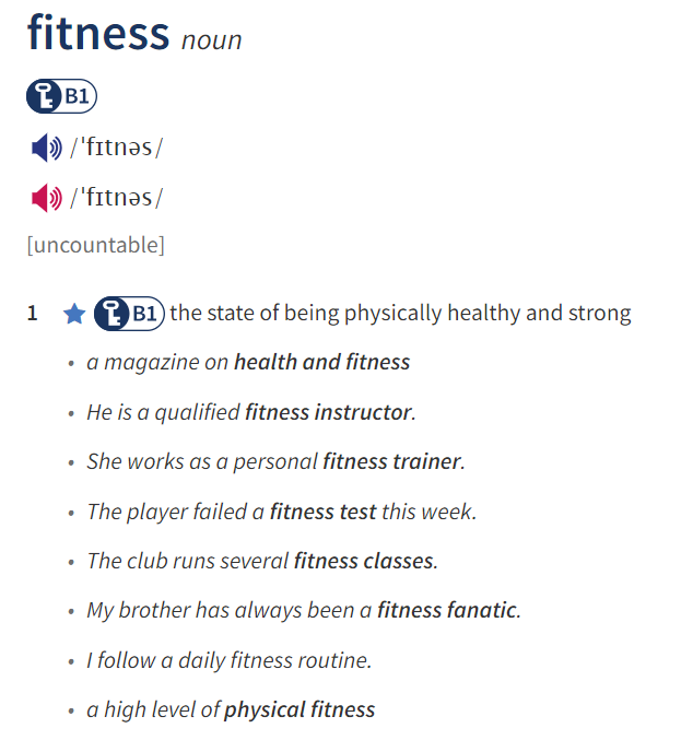 Look at the entry of the word ‘fitness’ in a dictionary. Use what you can get from the entry to complete the sentences with two or three words.