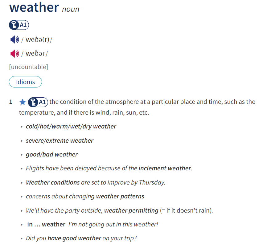 Look at the entry of the word ‘weather’ in a dictionary. Use what you can get from the entry to complete the sentences with two or three words.