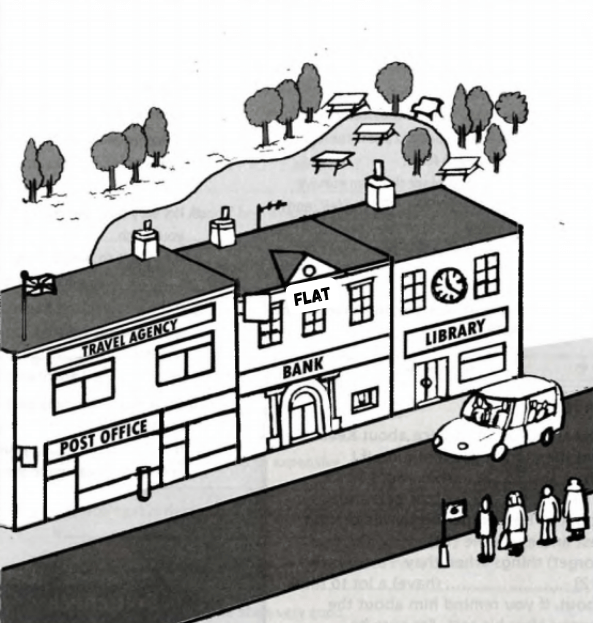 The post office is the travel agency. There is a flag on top of the building. The bank is the post office and the library. My flat is the bank. My flat is near the park. The park is the library. There are picnic tables the trees. The library is to the bank. There is a clock on the wall of the library. There is a car in of the library. There is a family in the car.