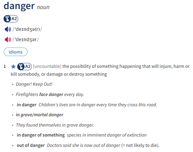 Look at the entry of the word ‘danger’ in a dictionary. Use what you can get from the entry to complete the sentences with two or three words.