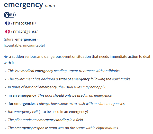Look at the entry of the word ‘emergency’ in a dictionary. Use what you can get from the entry to complete the sentences with two or three words.