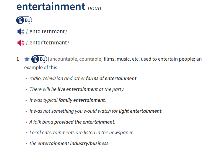 Look at the entry of the word ‘entertainment’ in a dictionary. Use what you can get from the entry to complete the sentences with two or three words.