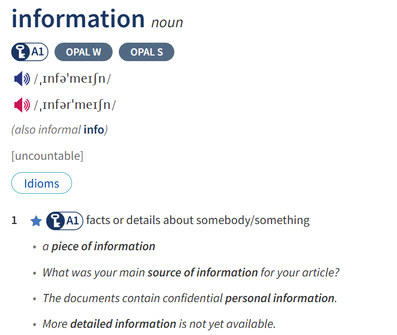 Look at the entry of the word 'information' in a dictionary. Use what you can get from the entry to complete the sentences with no more than three words.