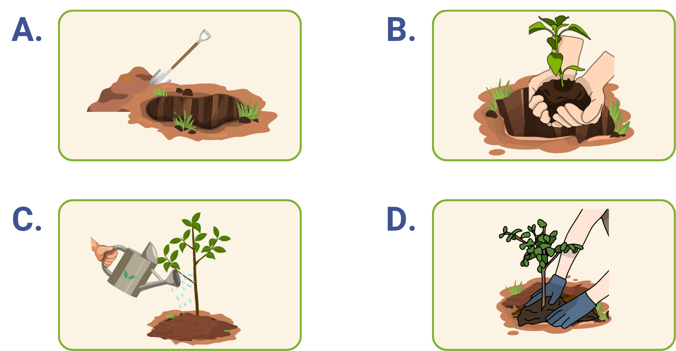 The gardener dug a small hole in the soil, placed a young plant into the hole, and covered the roots with soil. Which photo is the missing step?