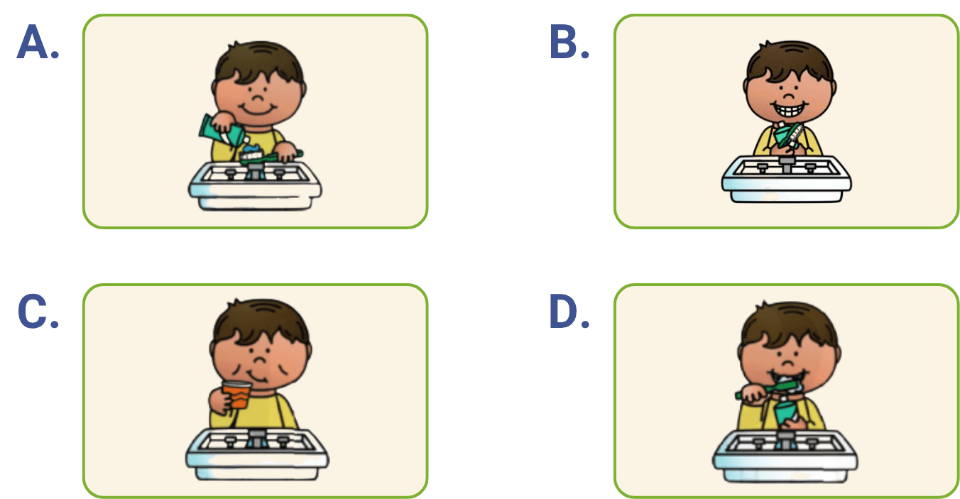 The child has got his toothbrush and toothpaste, put toothpaste on the brush, and brushed his teeth. Which photo is the missing step?