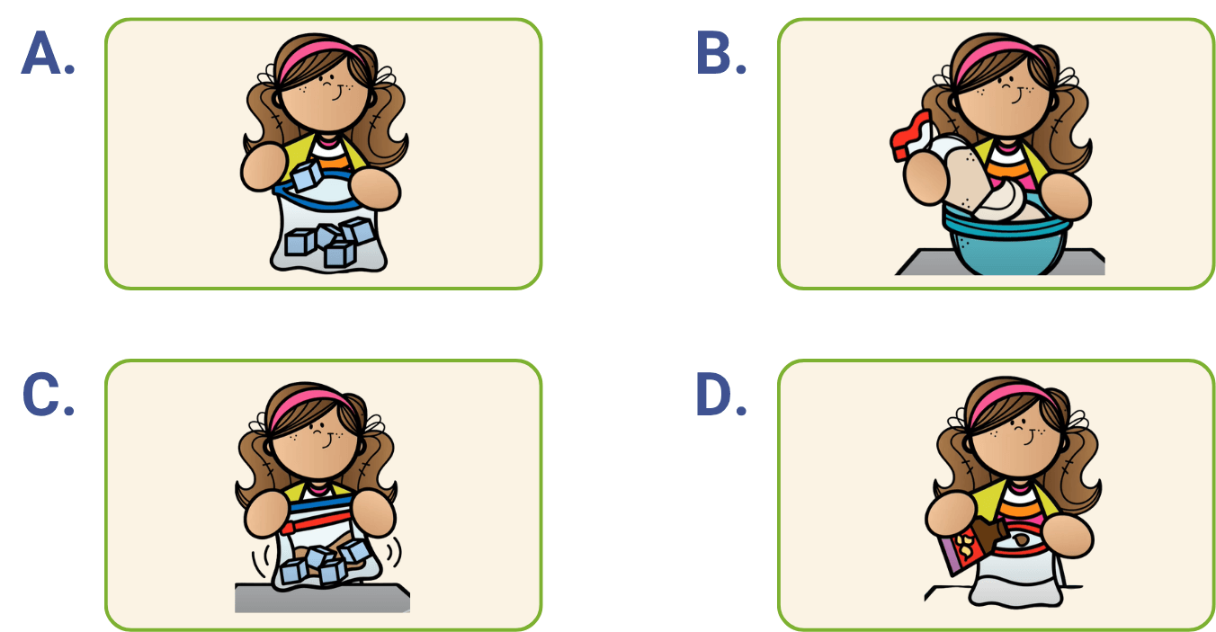 The little girl mixed the sugar, milk and vanilla in the small zip bag. Then she mixed ice and salt in the large zip bag. She placed the small bag inside the large bag and shook the bag for 7 to 10 minutes. Which photo is the missing step?
