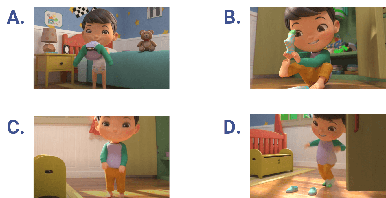 The boy has worn his long-sleeve shirt, pulled on his pants, and slipped on his socks. Which photo is the missing step?