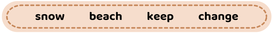 There are four seasons in a year: spring, summer, autumn, and winter. In spring, the weather is warm, and flowers grow. In summer, it is hot, and people like to go to the . Autumn is cool, and the leaves color and fall from the trees. Winter is cold, and some places get . People wear coats, hats, and scarves to warm in winter. Every season has different weather and activities.
