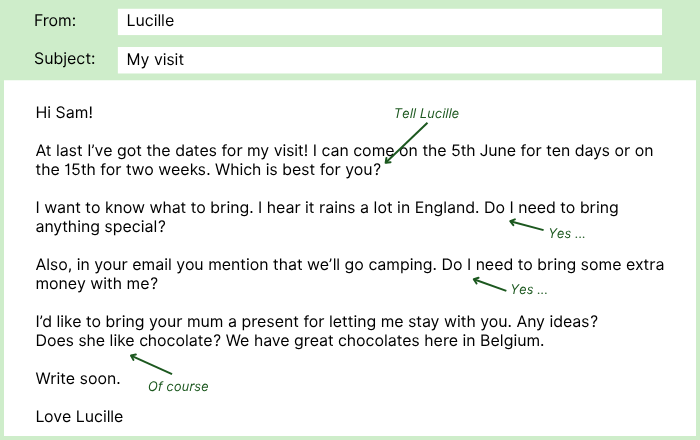 Read this email from your English-speaking friend Lucille and the notes you have made.