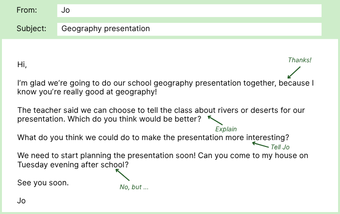 Read this email from your English-speaking friend Jo and the notes you have made.