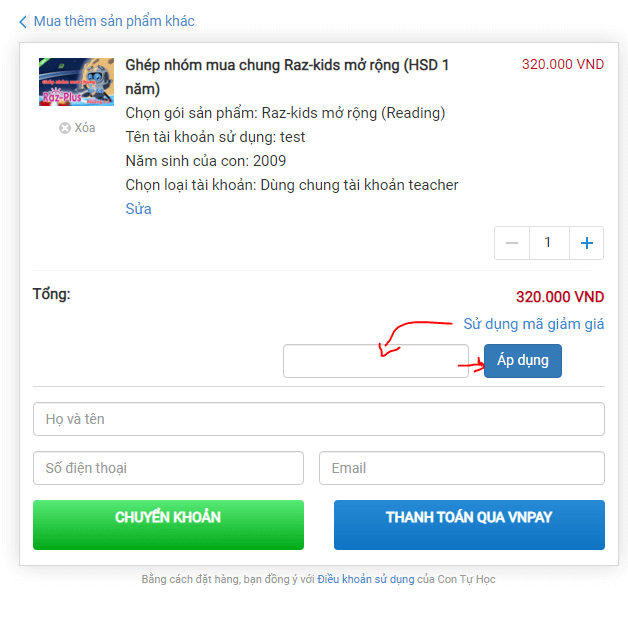 Khi đặt mua chương trình sách Tiếng Anh Raz-plus và các học phần khác của LearningA-Z hoặc các khóa học Read and Connect của TS. Trần Hương Quỳnh, tới bước thanh toán, quý khách hàng click Sử dụng mã giám giá và nhập mã là 2022Safe: