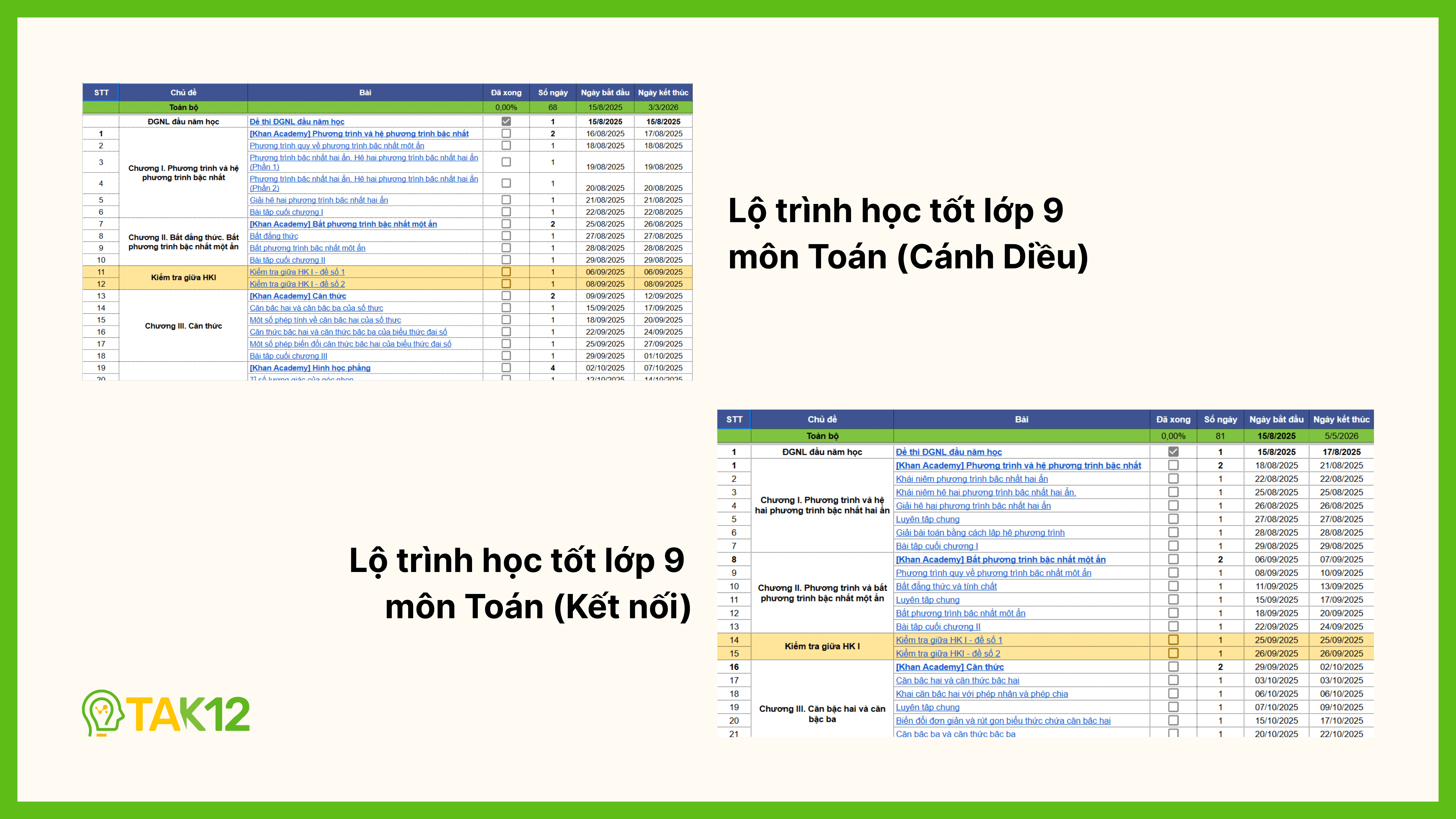Bộ chương trình Học tốt môn Toán dành cho học sinh lớp 9 được TAK12 xây dựng theo các bộ sách hiện hành gồm: Kết nối tri thức và Cánh diều. Trong các chương trình, học sinh được tiếp cận: